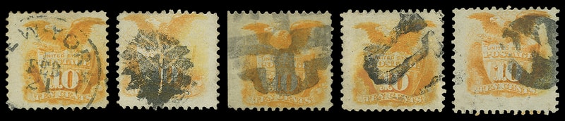 1869, 10¢ yellow - Fancy Cancels, group of five, all fresh and typically centered, one with natural straightedge, and New York cds, all appear sound, F.-V.F. cancel group, nice selection.