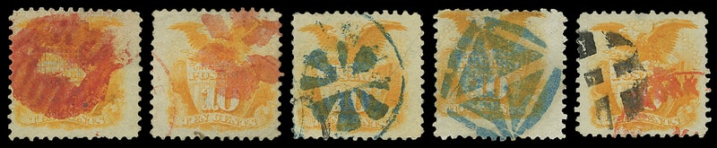 1869, 10¢ yellow - Color Cancels, five singles, all fresh and typically centered, all with fancy cancels: two red, two blue, another with attractive segmented cork with red New York exchange cds, small, mostly trivial flaws, F.-V.F. and attractive group.