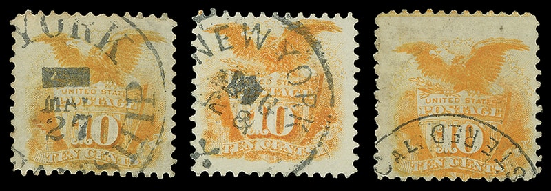 1869, 10¢ yellow, group of three with cds cancels comprising "N. York Steamship", black "New York" foreign mail and partial San Francisco "Registered", couple flaws, F.-V.F. trio.