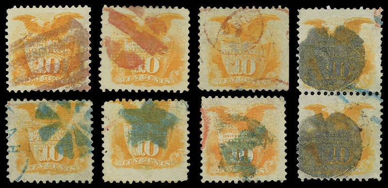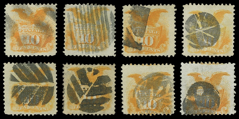 1869, 10¢ yellow - Fancy Cancels, group of 8 used stamps with better cancels including Philadelphia FM six-bar grid, circular grid, small quartered cork, three leaves, etc, some small flaws, F.-V.F. and attractive group.