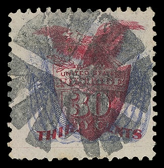 1869, 30¢ ultramarine & carmine, exceptionally well centered, neat open three-bar grid cancel, fairly fresh color but some light overall paper toning, otherwise Extremely Fine.
