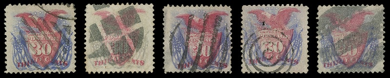 1869, 30¢ ultramarine & carmine, couple minor flaws, F.-V.F. and attractive group, group of three singles, typical centering, good colors, each with NYFM radial fancy cancel.