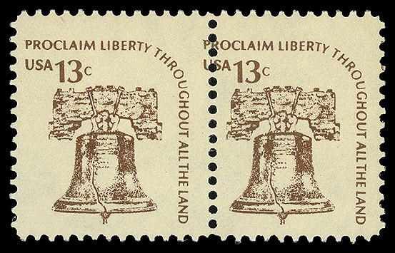 13c Liberty Bell Counterfeit, horizontal pair, never hinged, the so called "Boston" counterfeit, F.-V.F. and scarce.