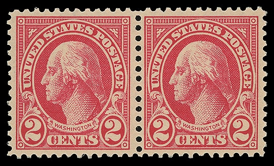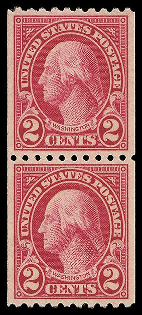 1923, 2¢ Washington, type I, horizontal rotary press coil, pair, o.g., never hinged, choice centered with deep rich color and strong impression, a Extremely Fine to Superb pair; with 2007 P.S.E. and 2014 P.F. certificates, both graded ( XF-SUP 95, SMQ $110 ).