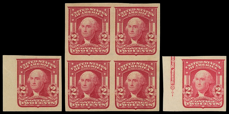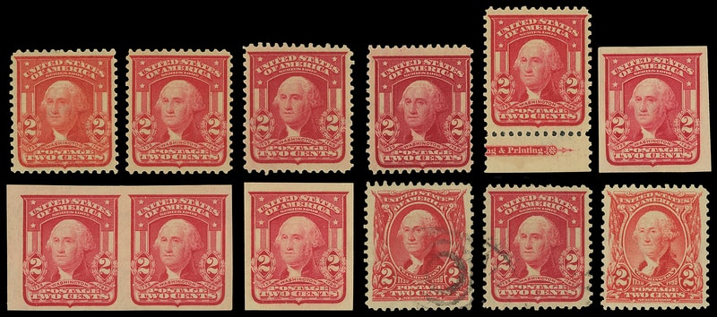 1903, 2¢ carmine, group of 14 including #301 (gem used), #301 (gem nh), 319, 319f, Type I, II mix, with or without wmk, most all full o.g.; 320 (4) VF, XF, or S; 320A XF block 4 lake imperf NH; 1 single 320A, large margins, LH. one carmine lake is fine. Great fresh colors for reference, several gems, block of 4, F.-V.F. or better group.