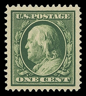 1910, 1¢ green, S.L. watermark, well centered with large margins, rich color, fresh and Extremely Fine; with 2007 P.S.E. certificate graded ( XF 90, SMQ $55 ).