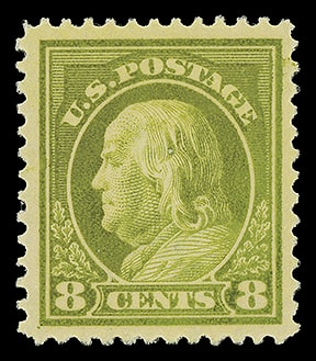 1912, 8¢ pale olive green, S.L. watermark, perf. 12, o.g., never hinged, nicely centered, strong color, Very Fine to Extremely Fine; with 2013 P.S.E. certificate graded ( VF-XF 85, SMQ $135 ).