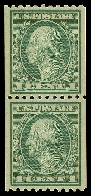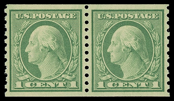 1916, 1¢ green, unwatermarked, horizontal rotary press coil, pair, o.g., never hinged, exceptionally well centered, fresh and Extremely Fine to Superb; with 2013 P.S.E. certificate graded ( XF-SUP 95, SMQ $110 ).