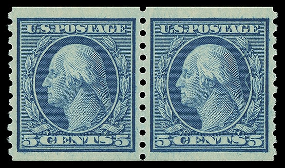 1919, 5¢ blue, unwatermarked, horizontal rotary press coil, pair, o.g., never hinged, choice centering with large margins, strong color, Extremely Fine to Superb; with 2025 P.S.E. certificate graded ( XF-SUP 95, SMQ $125 ).