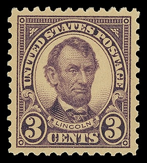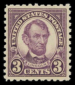 1925, 3¢ Lincoln, rotary press printing, perf. 10, beautifully centered, rich color, particularly fresh and Extremely Fine; with 2007 P.S.E. certificate graded ( XF 90, SMQ $110 ).
