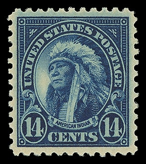 1923, 14¢ American Indian, o.g., never hinged, exceptionally well centered, intense color and impression, Extremely Fine to Superb; with 2021 P.S.E. certificate graded ( XF-SUP 95, SMQ $90 ).