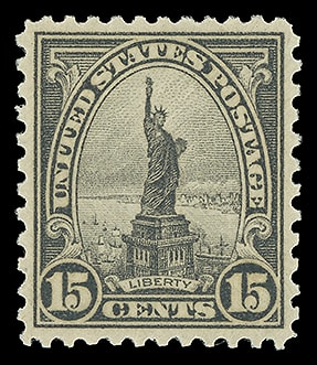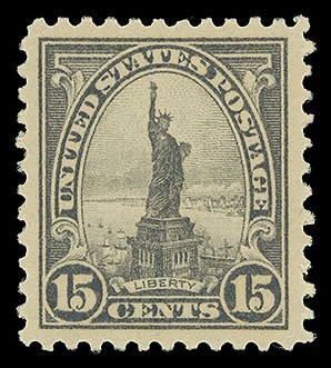 1922, 15¢ Statue of Liberty, o.g., never hinged, exceedingly well centered, fresh and Extremely Fine; with 2006 P.S.E. certificate graded ( XF 90, SMQ $90 ).