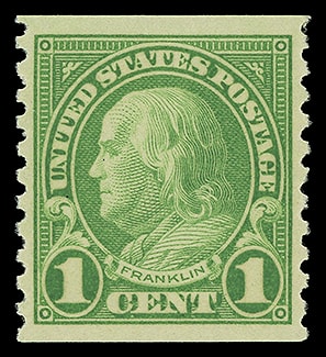 1923, 1¢ Franklin, horizontal rotary press coil, o.g., never hinged, exceedingly well centered with bright color, fresh and Extremely Fine to Superb; with 2012 P.F. certificate graded ( XF-SUP 95, SMQ $65 ).