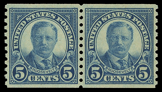 1924, 5¢ Roosevelt, horizontal rotary press coil, pair, o.g., never hinged, remarkably well centered with deep color, fresh and Extremely Fine to Superb pair; with 2020 P.S.E. certificate graded ( XF-SUP 95, SMQ $115 ).