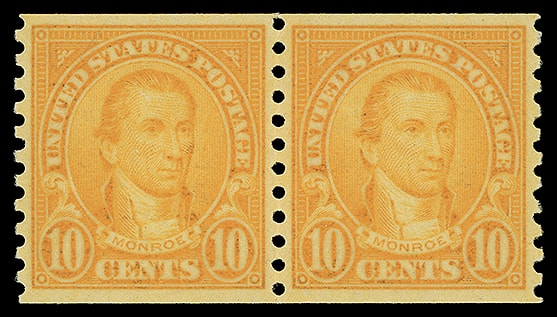 1924, 10¢ Monroe, horizontal rotary press coil, pair, o.g., never hinged, exceedingly well centered with radiant color, Extremely Fine and choice; with 2012 P.F. certificate graded ( XF 90 XQ, SMQ $85 ).