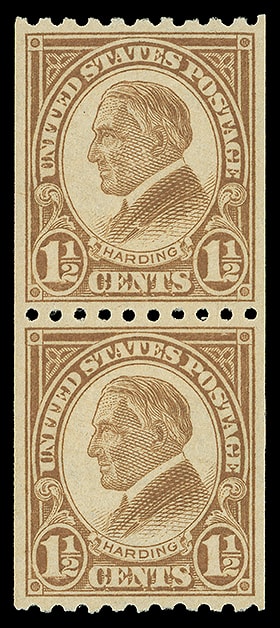 1925, 1½¢ Harding, horizontal rotary press coil, pair, o.g., never hinged, exceptionally well centered, bright color, fresh and Extremely Fine to Superb; with 2021 P.F. and 2021 P.S.E. certificates, both graded ( XF-SUP 95, SMQ $120 ).