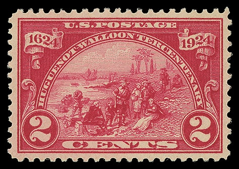 1924, 2¢ Huguenot-Walloon, o.g., never hinged, beautifully centered, rich color, fresh and Extremely Fine to Superb; with 2013 P.S.E. certificate graded ( XF-SUP 95, SMQ $140 ). Scott No. 615.