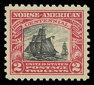 1925, 2¢ Norse-American, o.g., never hinged, well centered, deep color, Extremely Fine to Superb; with 2021 P.S.E. certificate graded ( XF-SUP 95, SMQ $70 ). Scott No. 620.
