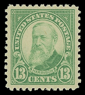 1926, 13¢ Harrison, o.g., never hinged, remarkably well centered within large margins, radiant color on bright paper, particularly fresh and Extremely Fine to Superb; with 2005 P.S.E. certificate graded ( XF-SUP 95 ). Scott No. 622.