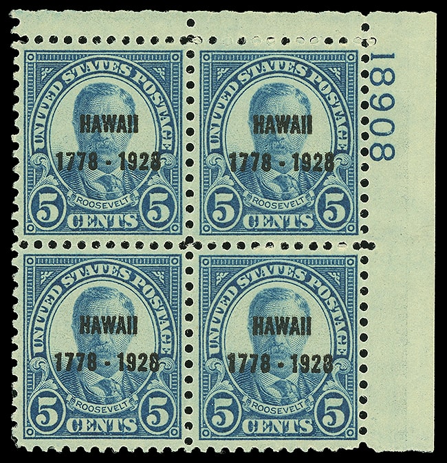 1928, 5¢ Hawaii, top right 18908 plate block of four, o.g., upper right stamp hinged, well centered, Very Fine.