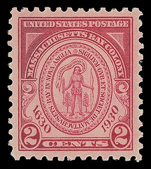 1930, 2¢ Massachusetts Bay Colony, o.g., never hinged, perfectly centered with large balanced margins, rich deep color, a Superb gem; with 2007 P.S.E. certificate graded ( SUP 98 ). Scott No. 682.