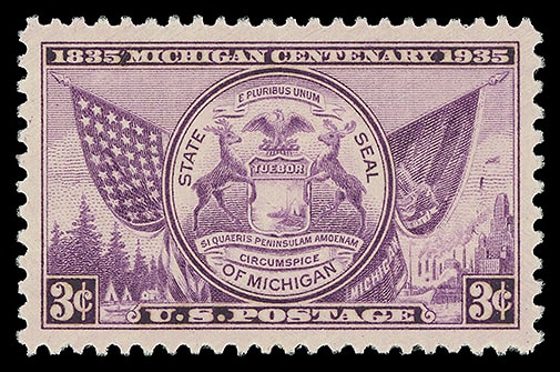 1935, 3¢ Michigan Centenary, o.g., never hinged, perfectly centered within large margins, bright and fresh, a Superb gem; with 2022 P.S.E. certificate graded ( SUP 98 ). Scott No. 775.