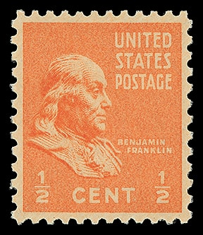1938, ½¢ Franklin, o.g., never hinged, perfectly centered, strong color, a Superb gem; with 2007 P.S.E. certificate graded ( SUP 98 ). Scott No. 803.