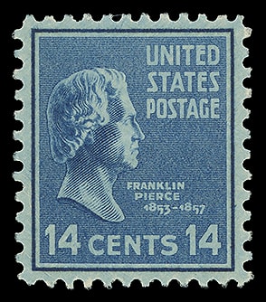 1938, 14¢ Franklin Pierce, o.g., never hinged, exceedingly well centered with wide margins, intense color and impression, Superb; with 2019 P.S.E. certificate graded ( SUP 98 ). Scott No. 819.