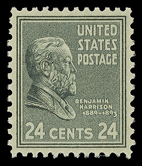 1938, 24¢ Benjamin Harrison, o.g., never hinged, perfectly centered within balanced margins, bright color, fresh and Superb; with 2006 P.S.E. certificate graded ( SUP 98 ). Scott No. 828.