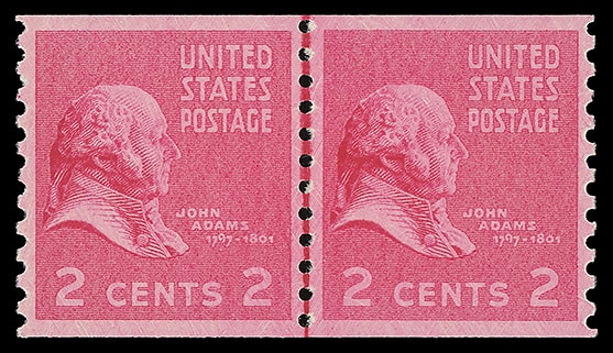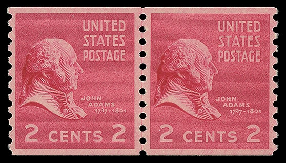 1939, 2¢ John Adams, horizontal coil, line pair, o.g., never hinged, remarkably well centered, strong color, choice and Extremely Fine to Superb; with 2012 P.S.E. certificate graded ( XF-SUP 95 ). Scott No. 841.