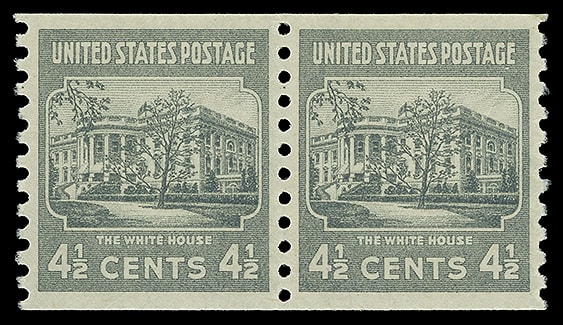 1939, 4½¢ White House, horizontal coil, pair, o.g., never hinged, remarkably well centered, bright and fresh, Extremely Fine to Superb; with 2015 P.S.E. certificate graded ( XF-SUP 95 ). Scott No. 844.
