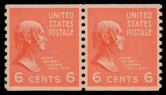 1939, 6¢ John Quincy Adams, horizontal coil, pair, o.g., never hinged, exceedingly well centered with brilliant color, fresh and Extremely Fine to Superb; with 2007 P.S.E. certificate graded ( XF-SUP 95 ). Scott No. 846.