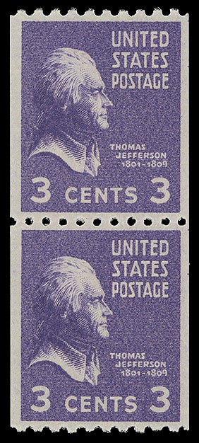 1939, 3¢ Jefferson, vertical coil, pair, o.g., never hinged, attractively centered, rich color, Extremely Fine and fresh; with 2015 P.S.E. certificate graded ( XF 90 ). Scott No. 851.