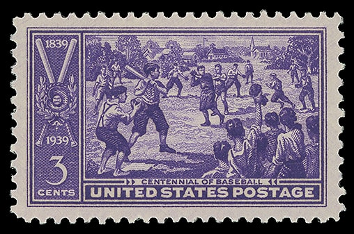 1939, 3¢ Baseball Centennial, o.g., never hinged, exceptionally well centered within extra large margins, vibrant color, fresh and Superb. Scott No. 855.