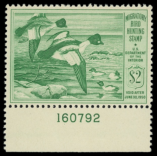 Federal Duck Stamp, 1946, $1 Redhead Ducks, group of four Mint N.H. comprising RW13 with plate number 158448 selvage, RW16 with plate number 160792 selvage, RW25 and RW33, plus additional three faulty not counted, RW13 gum creases, RW25 some skips, Very Fine group.