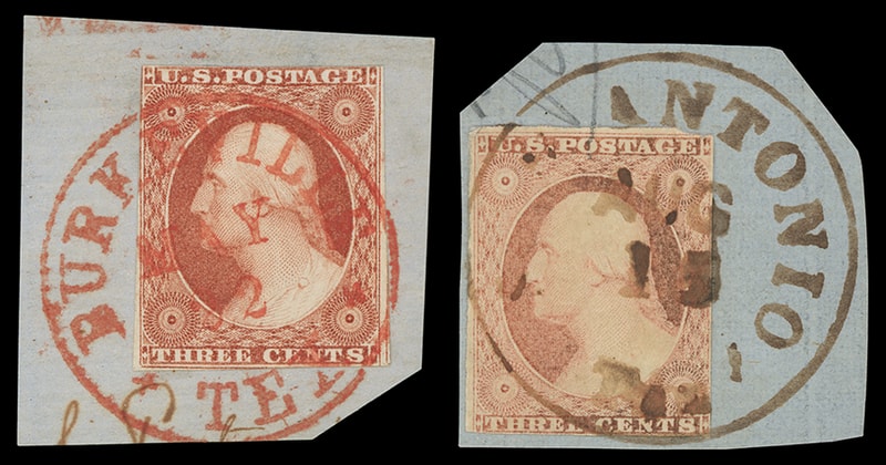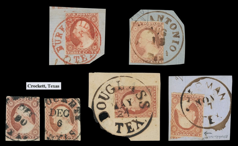 1852, 3¢ dull red - Texas Cancels, group of six town cds cancels comprising red Burkeville on piece, brown San Antonio on piece, brown Douglas balloon-style on piece (D eroded), brown Sherman on piece, and two Crockett strikes; some flaws, F.-V.F. and scarce group.