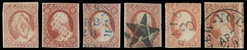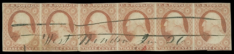 1852-57, 3¢ bright claret, type II, strip of six, manuscript cancel and postmark across strip, mostly large margins to touched in couple places, small faults, F.-V.F. appearance and scarce used strip.