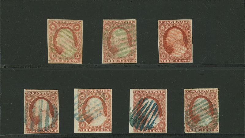 1852, 3¢ dull red, type II - Color Grid Cancels, group of seven comprising olive green , green , red and four blue grids, few flaws to be expected, F.-V.F. and attractive group.