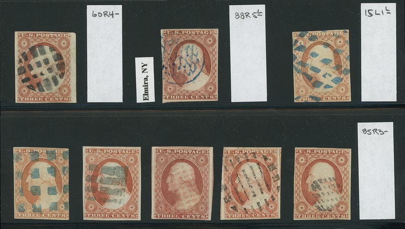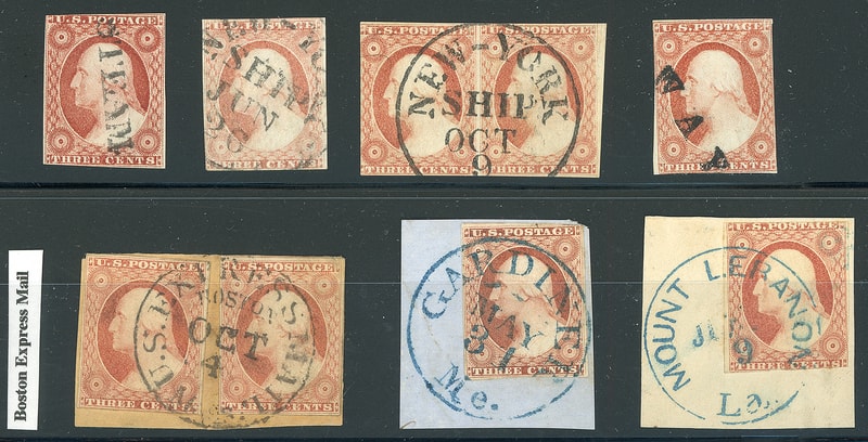 1852, 3¢ dull red - Cancel Group, group of 7 comprising five singles, two singles on piece and one pair comprising cancels of "Steam", "Way", "New York, Ship" cds on single and pair, "U.S. Express Mail, Boston, Mass." cds ties two singles on piece, blue "Gardiner Me." cds on piece and blue "Mount Lebanon La." cds on piece, some nice strikes, some small flaws, F.-V.F. group.