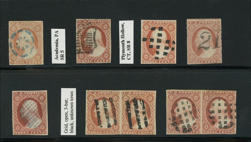 1852, 3¢ dull red - Better Cancels, selected group of 13 singles and 2 pairs with various grids including colors of blue, red and ultramarine, plus blue radial geometric of Academia Pa., elaborate geometric of Plymouth Hollow Ct., New York "21" due rating, etc, each plated, some flaws to be expected, F.-V.F. group.