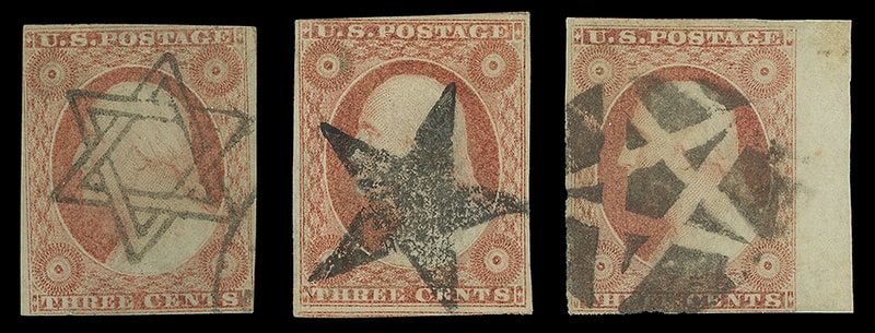 1852, 3¢ dull red, type II - Star Cancels, group of three comprising Intertwined Star of David of Chicopee, Five-Point Star and Negative Incised Five-Point Star, plated 97R3, 69L1L and 50L3, Very Fine star cancel trio.