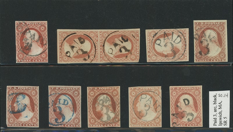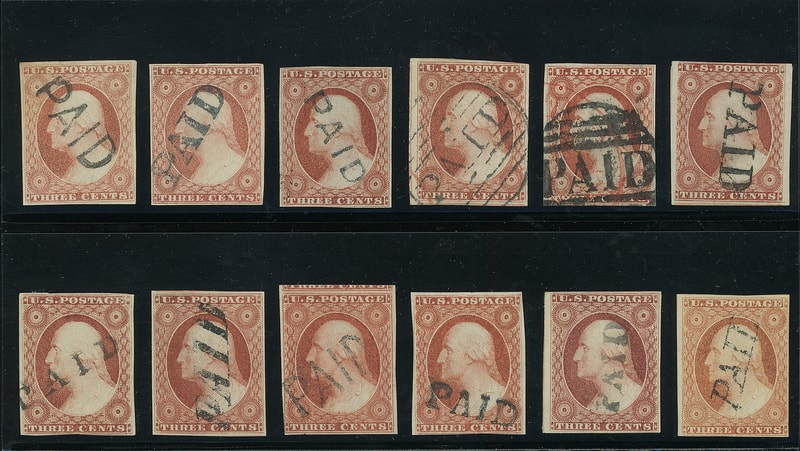 1852, 3¢ dull red - Paid Cancels, wonderful group of 20 singles and one pair including mostly different " Paid " straightlines with varous font styles, " Paid 3 " in circle with blue, grayish, brown oxide strikes, "Paid 3" arc and blue "3" cancels, mostly plated, some small flaws, a Very Fine and wonderful group.