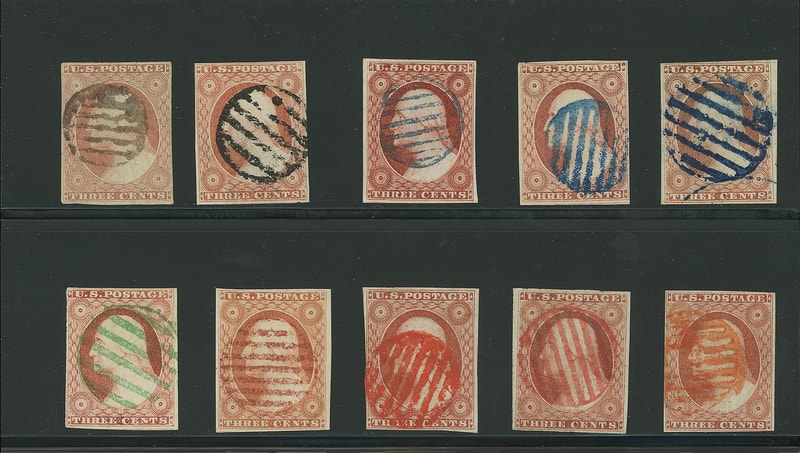1852, 3¢ dull red - Color Circular Grid Cancels, select group of 10 comprising black, brown, ultramarine, blue, dark blue, green , magenta, paint red, red and red orange, nice margins and good color, each plated, some flaws to be expected, Very Fine and attractive group.