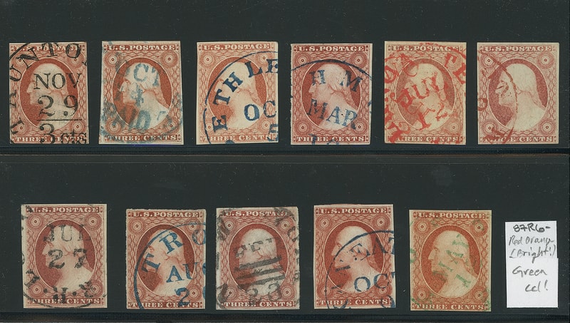 1852, 3¢ dull red - Town CDS Cancels, nice group with colors and better cds types including blue, red, magenta, bright green , "Taunton, 3 cts", New York four-bar, railroad, Charleston "Paid", etc., rich colors and good margins, each plated, some flaws to be expected.