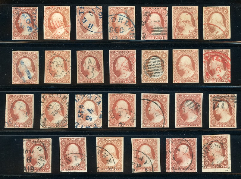 1852, 3¢ dull red - Select Plated Group, select plated group of 27 outstanding singles nearly all four margins, some with huge margins in gem appearance, some canceled with red or blue color cancels, range of shades, some small flaws to be expected, a Very Fine to Extremely Fine premium group.