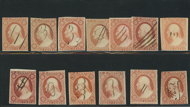 1852, 3¢ dull red - Manuscript Cancels, group of 13 with a variety of ms. cancels including squiggle, underlined "Paid", "$", "3" and double "3", hatching, etc., some flaws, F.-V.F. group.