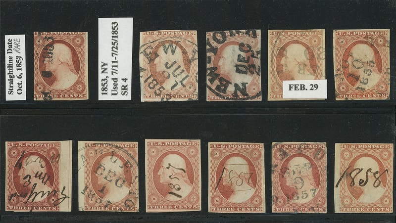 1852, 3¢ dull red - Dated Cancels, interesting group of 11 including 1853 straightline dated, "New York, Jun 21, 1853" special cds, New York Dec. 25 Christmas, a Leap Year Feb. 29th, 1855 and 1857 cds dated, plus ms. 1856 and 1857, 1858 dated, some small flaws, F.-V.F. group.
