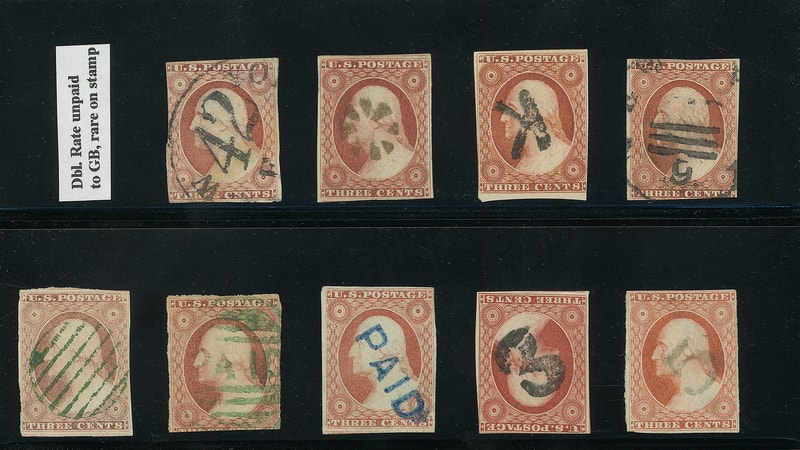 1851-52, 3¢ - Better Cancels, group of 9 with better cancels including "New York 42" debit exchange cds, small cricle of wedges, sharp "K" on #10A, New York three-bar on #10, green circular grid, green "Paid" grid , blue "Paid", "3" and "5", small flaws, Very Fine strikes.