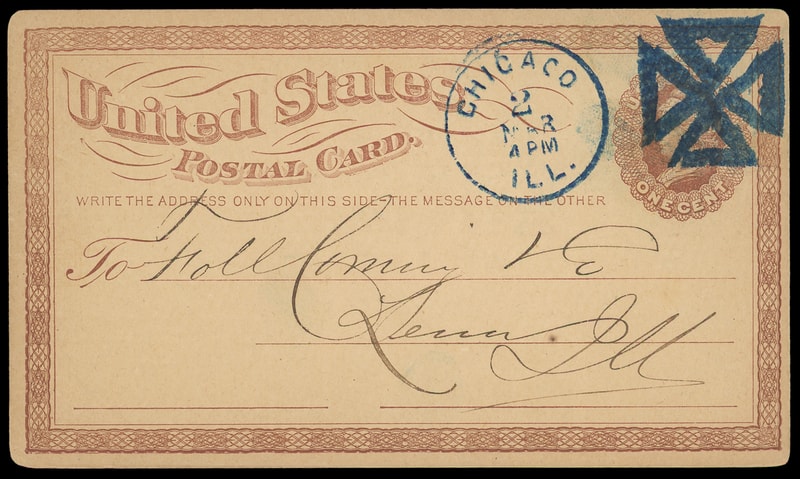 (Chicago Blue) Maltese Cross, gem strike duplexed with "Chicago Ill. 2 Mar" cds on 1¢ postal card (UX3) to Lena Ill., Extremely Fine and choice complete strike.