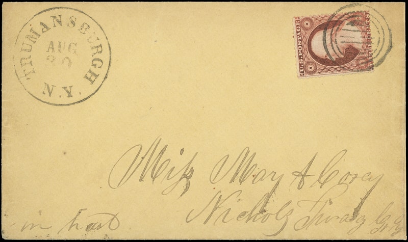 Six-Bar Grid within Three Rings, bold strike ties 3¢ dull red (26) , deep color, matching "Trumansburgh N.Y. Aug 30" cds on yellow cover to Nichols N.Y., Extremely Fine and choice strike.